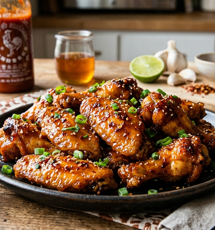 - Pour the Sriracha honey sauce over the wings.